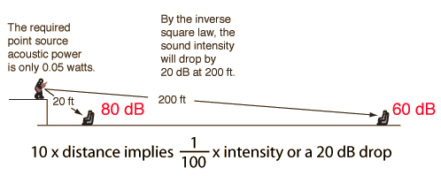 In an open area, sound drops off according to the inverse square law. In an auditorium where the front seats are 6 meters (20 ft) from the sound source and the back seats are 60 m (200 ft) from the sound source, the sound intensity would drop by a factor of 100 ( = 20 decibels )