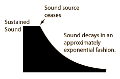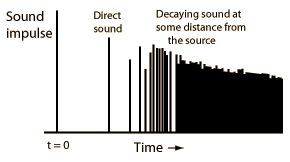 Reverberant Sound FieldThe sketch below depicts the sound received by a single listener as a function of time as a result of a sharp sound pulse some distance away. The direct sound received is followed by distinct reflected sounds and then a collection of many reflected sounds which blend and overlap into what is called reverberation. The delay between the direct sound and the first reflected sound is a significant characteristic for an auditorium, though not as important as the overall reverberation time. ![]()