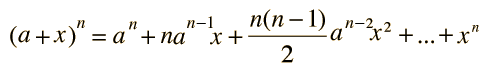 Binomial ExpansionFor any power of n, the binomial (a + x) can be expanded ![]() This is particularly useful when x is very much less than a so that the first few terms provide a good approximation of the value of the expression. There will always be n+1 terms and the general form is: ![]()