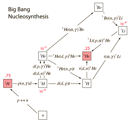 Hydrogen and helium account for nearly all the nuclear matter in today's universe. This is consistent with the standard or "big bang" model. The process of forming the hydrogen and helium and other trace constituents is often called "big bang nucleosynthesis". Schramm's figures for relative abundances indicate that helium is about 25% by mass and hydrogen about 73% with all other elements constituting less than 2%. Carroll & Ostlie give 23 to 24% helium. There is a window of uncertainty, but it is clear that hydrogen and helium make up 98% plus of the ordinary matter in the universe. This high percentage of helium argues strongly for the big bang model, since other models gave very small percentages of helium. Since there is no known process which significantly changes this H/He ratio, it is taken to be the ratio which existed at the time when the deuteron became stable in the expansion of the universe. This ratio is significant as a test of cosmological models since it will be affected by the time period from the time when the temperature dropped below that necessary to produce neutrons from protons to the time when the deuteron became stable, halting the decay of the free neutrons.