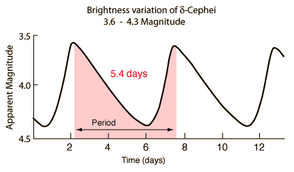 Cepheid VariablesNamed after delta-Cephei, Cepheid Variables are the most important type of variable because it has been discovered that their periods of variability are related to their absolute luminosity. This makes them invaluable as a contributer to astronomical distance measurement. The periods are very regular and range from 1 to 100 days. ![]() The shape of the Cephiad luminosity curve is often referred to as a "shark fin" shape when plotted as magnitude vs period. It should be noted that the smooth curve is an average behavior. There is considerable scatter about such a curve, at least in the observations.