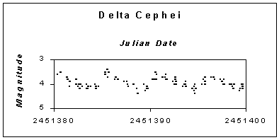 delta CepheiThe namesake star in the very important class of stars known as Cepheid variables, this star formed part of the original study in which Henrietta Leavitt first discovered that the periods of luminosity were related to their absolute luminosity. This has proved to be an important distance measuring tool. ![]() Analysis of the spectrum of delta Cephei suggests that along with the variation in brightness there is a velocity of somewhat over 20 km/s associated with the orbit, a swing in temperatre between 5500 K and about 6600 K, and a change in diameter of about 15% (Kaufmann). |