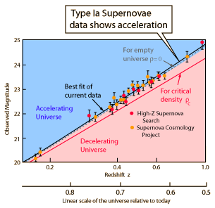 | Measurement of the redshift of distant type Ia supernovae is one of the types of evidence for and accelerated expansion of the universe and hence for dark energy. |
