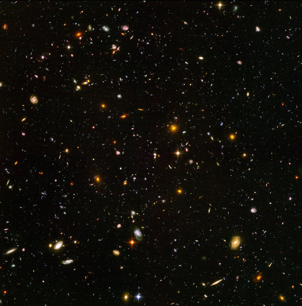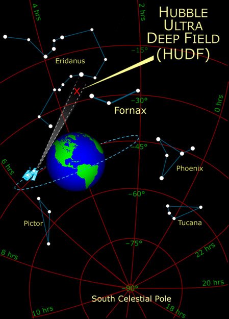 The above NASA illustration depicts the range of view of some of the galaxies of the ultradeep field as beingin the range of 400 to 700 million years after the big bang, some of the most distant objects ever viewed. The NASA illustration at right shows the location of the view.