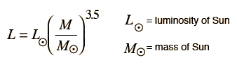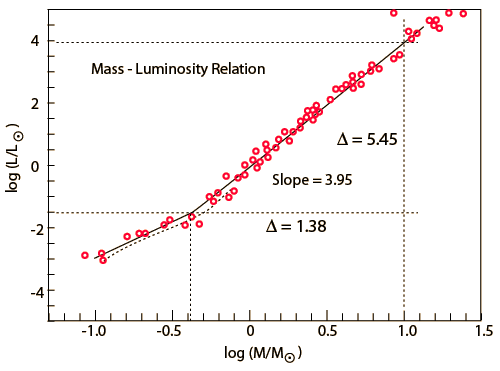 The power of 3.95 obtained from the upper part of this data shows the approach, but the range of masses is rather small. The value of 3.5 is most commonly used, and will be used in an estimate of stellar lifetimes.