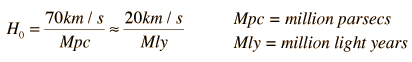 Hubble's LawHubble's law is a statement of a direct correlation between the distance to a galaxy and its recessional velocity as determined by the red shift. It can be stated as ![]() ![]() The Particle Data Group documents quote a "best modern value" of the Hubble parameter as 72 km/s per megaparsec (+/- 10%). This value comes from the use of type Ia supernovae (which give relative distances to about 5%) along with data from Cepheid variables gathered by the Hubble Space Telescope. The WMAP mission data leads to a Hubble constant of 71 +/- 5% km/s per megaparsec.