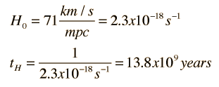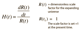Hubble ParameterThe proportionality between recession velocity and distance in the Hubble Law is called the Hubble constant, or more appropriately the Hubble parameter since it does depend upon time. In recent years the value of the Hubble parameter has been considerably refined, and the current value given by the WMAP mission is 71 km/s per megaparsec. The recession velocities of distant galaxies are known from the red shift, but the distances are much more uncertain. Distance measurement to nearby galaxies uses Cepheid variables as the main standard candle, but more distant galaxies must be examined to determine the Hubble constant since the direct Cepheid distances are all within the range of the gravitational pull of the local cluster. Use of the Hubble Space Telescope has permitted the detection of Cepheid variables in the Virgo cluster which have contributed to refinement of the distance scale. The Particle Data Group documents quote a "best modern value" of the Hubble constant as 72 km/s per megaparsec (+/- 10%). This value comes from the use of type Ia supernovae (which give relative distances to about 5%) along with data from Cepheid variables gathered by the Hubble Space Telescope. The value from the WMAP survey is 71 km/s per megaparsec. Another approach to the Hubble parameter gives emphasis to the fact that space itself is expanding, and at any given time can be described by a dimensionless scale factor R(t). The Hubble parameter is the ratio of the rate of change of the scale factor to the current value of the scale factor R: ![]() The scale factor R for a given observed object in the expanding universe relative to R0 = 1 at the present time may be implied from the z parameter expression of the redshift. The Hubble parameter has the dimensions of inverse time, so a Hubble time tH may be obtained by inverting the present value of the Hubble parameter. ![]() One must use caution in interpreting this "Hubble time" since the relationship of the expansion time to the Hubble time is different for the radiation dominated era and the mass dominated era. Projections of the expansion time may be made from the expansion models.