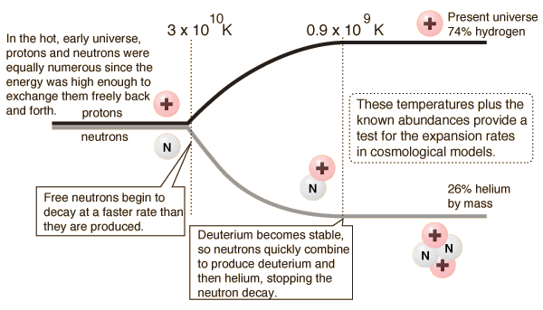 Hydrogen and helium account for nearly all the nuclear matter in today's universe. This is consistent with the standard or "big bang" model. The process of forming the hydrogen and helium and other trace constituents is often called "big bang nucleosynthesis". Schramm's figures for relative abundances indicate that helium is about 25% by mass and hydrogen about 73% with all other elements constituting less than 2%. Carroll & Ostlie give 23 to 24% helium. There is a window of uncertainty, but it is clear that hydrogen and helium make up 98% plus of the ordinary matter in the universe. This high percentage of helium argues strongly for the big bang model, since other models gave very small percentages of helium. Since there is no known process which significantly changes this H/He ratio, it is taken to be the ratio which existed at the time when the deuteron became stable in the expansion of the universe. This ratio is significant as a test of cosmological models since it will be affected by the time period from the time when the temperature dropped below that necessary to produce neutrons from protons to the time when the deuteron became stable, halting the decay of the free neutrons.