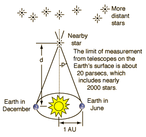 Stellar ParallaxA nearby star's apparent movement against the background of more distant stars as the Earth revolves around the Sun is referred to as stellar parallax.![]() This exaggerated view shows how we can see the movement of nearby stars relative to the background of much more distant stars and use that movement to calculate the distance to the nearby star.