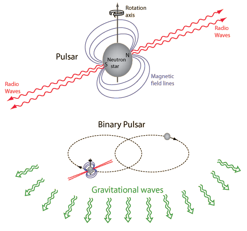 Binary Pulsars as a Test of General RelativityA pulsar is a rotating neutron star that produces periodic signals in Earth detectors as its beam of radiation sweeps over Earth once per rotation. A binary pulsar may have the additional feature of a measurable decrease in the orbital period as the two pulsars spiral inward toward each other. This change in the orbital period can be attributed to energy loss due to the emission of gravity waves, and the rate of energy loss can be calculated from Einstein's general relativity. Therefore the measurement of the rate of change of the orbital period provides a test of general relativity. ![]() The above illustration is patterned after one presented by the Nobel committee when they announced the 1993 Nobel Prize presented to Hulse and Taylor for the discovery of the first binary pulsar. Their discovery was based upon measurement of the Doppler shift of the radio frequency as the emitting pulsar orbited an unseen companion. The mean period of this pulsar (PSR 1913 + 16) was 0.05903 seconds, implying that this neutron star with a radius on the order of 10 kilometers but a mass comparable to the Sun is spinning on its axis almost 17 times per second! But that period varied several tens of microseconds with an orbital period of less than eight hours, corresponding to an orbital distance only several times the Moon-Earth distance. For these orbital characteristics, the general relativity correction to the perihelion motion would be 4 degrees per year compared to 43 seconds of arc per century for the perihelion of Mercury, the best example in our solar system. After four years of observation of this pulsar, it was determined that the orbital period was declining by about 75 microseconds per year, agreeing within about 0.5% with the rate predicted by general relativity. |