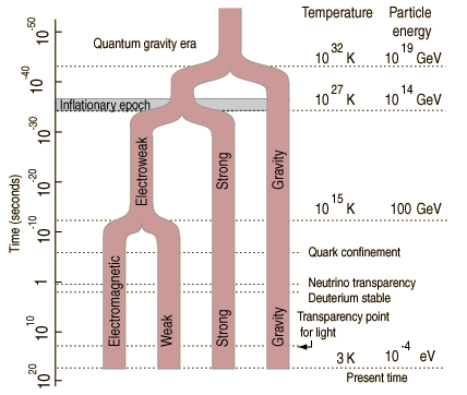 Big Bang Expansion and the Fundamental ForcesModeling of the "Big Bang" expansion of the universe at earlier and earlier times has led to the use of the "Planck time" of 10-43 seconds as a proposed interval during which all the fundamental forces were unified into a single force. Below is an attempt to illustrate the "spontaneous symmetry breaking" which is presumed to have separated the original force into the four forces which we see operating in the present, low temperature universe. Proposed energies and temperatures associated with each of the symmetry breaks are shown along with a modeling of the time elapsed in the big bang model. ![]()