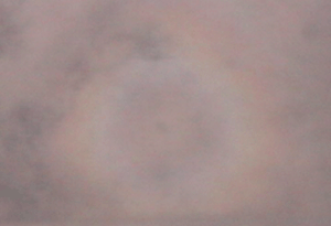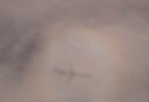 These glories were observed on an Atlanta to Toronto flight through clouds which were sometimes very close, sometimes distant. The size of the aircraft shadow depends upon the distance to the cloud, so when the cloud is close, the shadow is large. The size of the glory is determined by the size of the droplets in the cloud since it arises from diffraction from the water droplets. If the droplets are the same size, the glory for close and distant clouds is the same size as viewed by the eye.