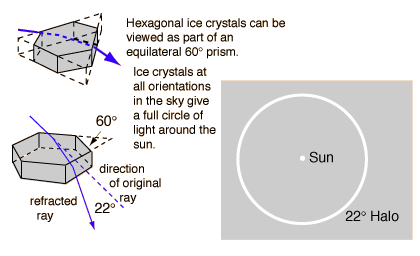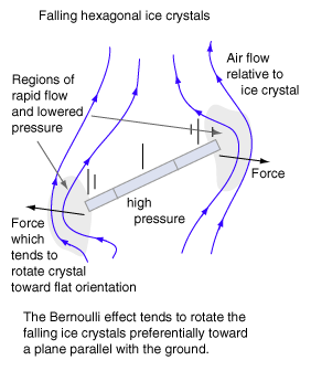 | The accentuated light at the intersection of a horizontal line through the Sun's position is attributed to the preferential orientation of the hexagonal ice crystals. Ron Edge models the tendency toward this flat orientation of the crystals in terms of the Bernoulli effect.