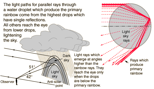 Dark Sky Between Rainbows![]() The light rays which form the primary rainbow are the rays of that color which strike the eye from the highest angle, all other rays of that color emerging at an angle closer to the horizontal. Those additional rays contribute to the light sky under the rainbow, but that light is essentially achromatic since some rays of all colors emerge at those angles. On the other hand, the rays which form the secondary rainbow are the rays of that color which strike the eye from the lowest angle. This means that for falling droplets between the lowest angle of the secondary rainbow and the highest angle of the primary rainbow, there are no internally reflected rays which reach the observer's eye. According to Lynch and Livingston, this dark band is called "Alexander's dark band", named after the Greek sage Alexander of Aphrodisias. Alexander described this band in his chronicles in about 200 AD. ![]()