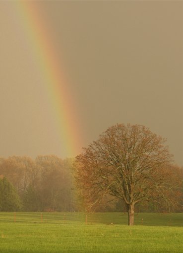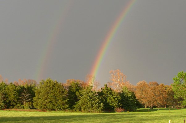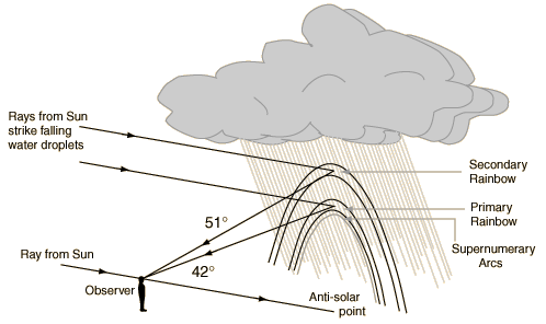 ![]() Rainbows are not seen in midday since the whole 42° circle is below the horizon at most latitudes. So rainbows tend to be seen most in the later afternoon when a thundershower has passed and the sun from the west is illuminating the receding edge of an eastwardly moving raincloud. It is possible to see the entire circle of the rainbow from an airplane since there can be falling droplets both above and below you.