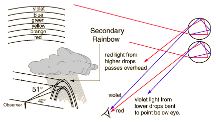 Secondary RainbowThe secondary rainbow is about 10° further out from the antisolar point than the pimary bow, is about twice as wide, and has its colors reversed. ![]() According to Schaaf, the light of the secondary bow is one-tenth the intensity of that of the primary bow, given the same viewing conditions. ![]() ![]() Photos by Mary Lassiter, used by permission. Note the reversal in the order of the colors in the secondary rainbow. These photos also show the increase in brightness inside the primary rainbow. The region between the two rainbows should be a bit darker than the sky just outside the secondary rainbow, but this is a smaller difference.