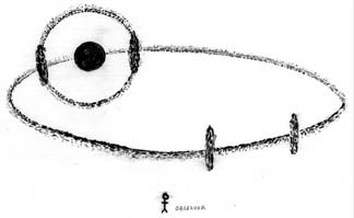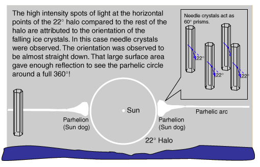 One of the remarkable things about Dr. Sadleir's experience was the observation of a parhelic circle which made a full 360° around the sky. "Over a period of 3/4 of an hour a complete ... 360° parhelic curcle developed at the same time as the usual sun halo [the 22° halo]. At the intersection of the two rings there were brilliant sun dogs with rainbow colouration. On the opposite side of the parhelic circle developed mirror sun dogs which were not rainbow coloured but just white light." |