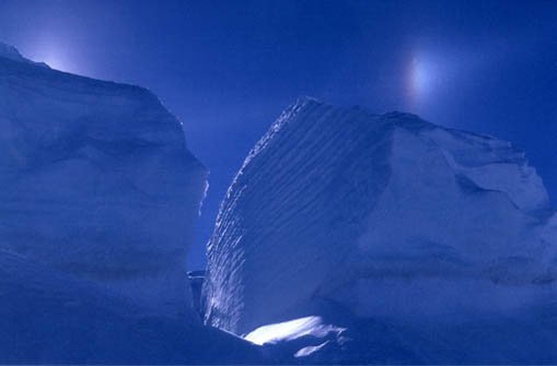 In the photo of the large split ice cliff above, the sun is to the left behind the cliff, which allowed this striking image of the right sun dog to be photographed. The left sun dog was photographed by hiding the sun behind the building to the right of the lower photo.
