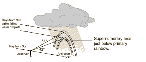 Supernumerary ArcsExtra bands, usually pale pink or green in color, are often seen on the inside of the primary rainbow. They result from interference of light rays which emerge from water droplets in the same direction. While the primary rainbow colors result from a concentration of the different colored rays in the maximum deviation direction, there are many other paths for light through the droplets, so that at angles below the rainbow angle there could be rays of different wavelengths which emerge together. The number of visible supernumerary arcs depends upon the size of the raindrops. ![]()