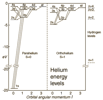 The electron energy levels for a helium atom demonstrate a number of features of multi-electron atoms. The labeling of the levels follows the spectroscopic notation.