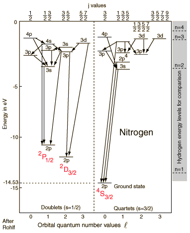 Nitrogen Energy Levels![]() With an electron configuration of 1s22s22p3, the element nitrogen has three electrons outside closed shells. The three spins can give a resultant of spin 3/2 (quartet states) or 1/2 (doublet states). In the diagram above, it is presumed that two of the electrons remain in their lowest states, and the lower case label on the levels specifies the state of the elevated electron. The upper case labels represent the collective states of the three p electrons. The ground state has all three spins aligned in the 4S3/2 state, the highest multiplicity state, consistent with Hund's rule #1. There are two other 2p states associated with spin S = 1/2 (doublets) for which the collective symbols are 2P1/2 and 2D3/2. The 2D3/2 state is lower in accordance with Hund's rule #2. The splitting with the different j values is not shown here. The lines connecting levels indicate radiative transitions, which are subject to selection rules depending upon the angular momenta.