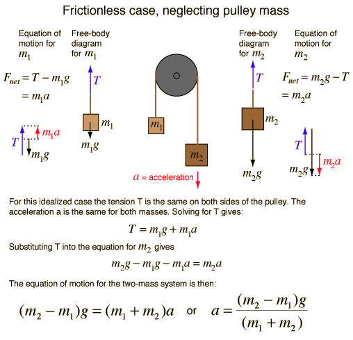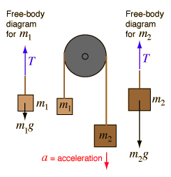 Atwood's MachineApplication of Newton's second law to masses suspended over a pulley. |