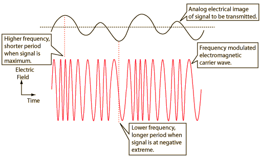 Frequency Modulation![]() The change in frequency, which is greatly exaggerated here, is proportional to the amplitude of the signal. An FM radio carrier around 100 MHz is limited to modulation of +/- 0.1 MHz. Normal FM stereo broadcast is within +/- .053 MHz.