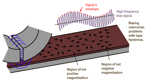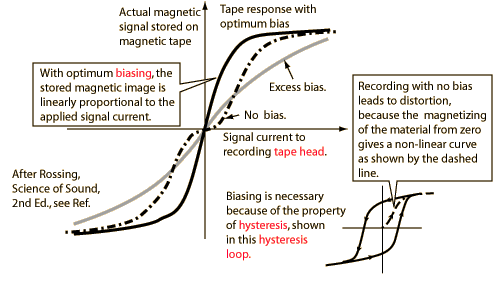 Biasing in Tape RecordingA music signal alone cannot be used to produce a faithful tape recording of a sound because the magnetization of the tape is so sensitive to its previous magnetic history, even the effects of the signal recorded just ahead of it. A high frequency bias signal is typically applied to the tape through the tape head along with the music signal to remove the effects of this magnetic history. This large bias signal (typically 40 to 150 kHz in frequency) keeps "stirring" the magnetization so that each signal to be recorded encounters the same magnetic starting conditions. The necessity for biasing has its origin in the magnetic property called hysteresis - the magnetic material tends to hold onto any magnetization it receives and must be actively driven back to zero to start over. Magnetic emulsions made with chromium dioxide require a larger biasing signal to make use of their wider dynamic range, so modern recorders have different bias settings for iron oxide, chromium dioxide, and metal tapes. With optimum biasing, the recorded magnetic image is proportional to the signal current applied to the record head. One could become almost philosophical about the process by which one can produce the sound of a beautiful symphony from a "ribbon of rust". Biasing is critical to this process of imposing the design of the symphony upon a medium which would tend to have random variations because of thermal energy and a kind of "inertia" in the form of hysteresis that resists the production of an undistorted image of the music. Biasing plays the role of "scrambling" or "stirring" the medium dynamically so that each element of the musical image you intend to impose will have the same "blank slate" upon which to write. The scrambling process of biasing also increases the sensitivity for the recording of a clean signal, i.e., you can record with a much smaller input signal because the medium is more susceptible to the imposition of the pattern you intend.