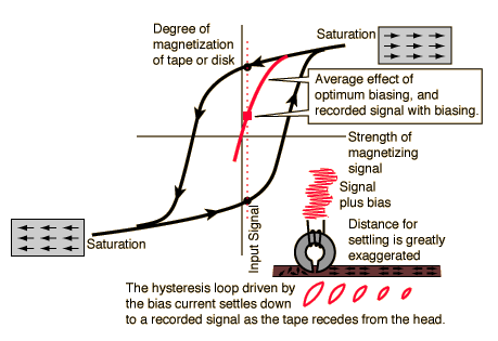 Hysteresis in Magnetic RecordingBecause of hysteresis, an input signal at the level indicated by the dashed line could give a magnetization anywhere between C and D, depending upon the immediate previous history of the tape (i.e., the signal which preceded it). This clearly unacceptable situation is remedied by the bias current which cycles the oxide grains around their hysteresis loops so quickly that the magetization averages to zero when no signal is applied. The result of the bias signal is like a magnetic eddy which settles down to zero if there is no signal superimposed upon it. If there is a signal, it offsets the bias signal so that it leaves a remnant magnetization proportional to the signal offset. ![]()