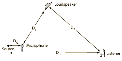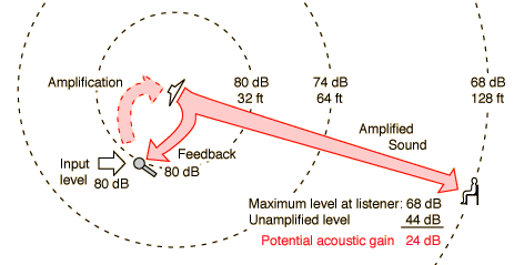 Maximum Amplification ConditionWhen the feedback to the microphone is equal to the original sound input level, the gain can no longer be increased without an uncontrolled increase in output, usually in the form of a loud ring at one frequency. Practically, the sound should be kept about 3 dB below that point. If 80 dB is the input level to the microphone, then 80 dB feedback return is an upper bound. Using the inverse square law, the resulting levels are as shown. ![]()