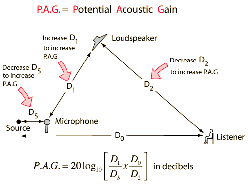 For a simple sound reinforcement system where the sound is assumed to drop off according to the inverse square law and the microphones and speakers are assumed to be omnidirectional, then the maximum achievable gain is determined by strictly geometric considerations. This simple case provides the framework for assessing what can be done in a real auditorium to increase the possible gain before feedback takes control.