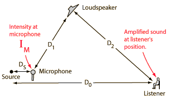You may enter values for the relevant distances in the simplified sound amplification system. Unspecified values will default to the values in the example model. You can change any values to convince yourself that the P.A.G. can be increased by increasing the distance from microphone to loudspeaker. The gain can also be increased by decreasing the distance from loudspeaker to listener or the distance from the source to the microphone.
