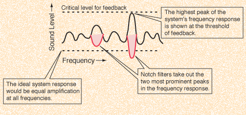 Notch FiltersWhen a non-uniform frequency response of an amplification system/room combination causes the system to "ring" before giving adequate amplification, the potential acoustic gain can sometimes be improved with the use of notch filters to take out the offending frequencies as illustrated below. Shown is the use of two notch filters to discriminate against the two most prominent peaks in the frequency response. ![]() Often several such tunable notch filters are packaged together and marketed as "feedback suppressors" . Sometimes such feedback suppressors are used to smooth out the roughest spots before undertaking a full-fledged equalization of the sound system.