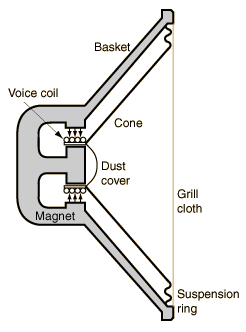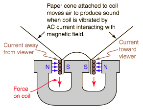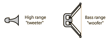Use of Multiple Drivers in LoudspeakersEven with a good enclosure, a single loudspeaker cannot be expected to deliver optimally balanced sound over the full audible sound spectrum. For the production of high frequencies, the driving element should be small and light to be able to respond rapidly to the applied signal. Such high frequency speakers are called "tweeters". On the other hand, a bass speaker should be large to efficiently impedance match to the air. Such speakers, called "woofers", must also be supplied with more power since the signal must drive a larger mass. Another factor is that the ear's response curves discriminate against bass, so that more acoustic power must be supplied in the bass range. It is usually desirable to have a third, mid-range, speaker to achieve a smooth frequency response. The appropriate frequency signals are routed to the speakers by a crossover network. ![]() |