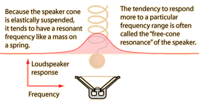 Loudspeaker Resonance![]() Direct-radiating cone-type loudspeakers must be mounted so that they are free to vibrate. This mounting is elastic, so there is an inherent resonant frequency of the speaker cone assembly -- like a mass on a spring. This free cone resonant frequency distorts the sound by responding more strongly to signals near its natural vibration frequency. This non-uniform response changes the frequency content in terms of the relative intensities of the harmonics and thus changes the timbre of the sound. Since the cone is undamped, it tends to produce "ringing" or "hangover" with frequencies near resonance. If the resonance is in the bass range, the bass will be "boomy".