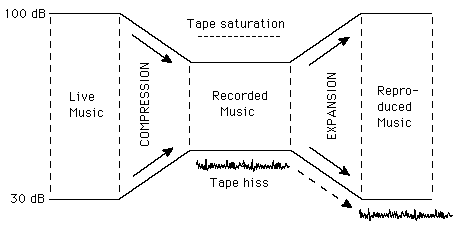 dbx Noise ReductionTwo inherent problems with recording onto tape cassettes are the limitation on dynamic range for distortion-free recording and the presence of high-frequency tape hiss. The live music to be recorded might have a dynamic range of 70 decibels, but you will do well to get 40 dB of dynamic range recorded on the tape. If you have carefully matched electronics to squeeze or compress the signal to 40 dB before recording and expand it back to 70 dB upon playback you can not only retain more of the dynamic range of the original music but also accomplish some tape noise reduction in the process. Note that soft music signals are made larger than the tape hiss level for recording, and then they are made smaller again on playback. This playback expansion also reduces tape hiss dramatically. Note also that the compression avoids distortion from tape saturation. |