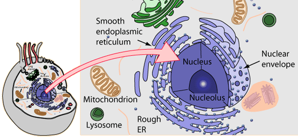 Cell Nucleus and Nuclear Envelope![]() The nucleus of a eukaryotic cell contains the DNA, the genetic material of the cell. The DNA contains the information necessary for constructing the cell and directing the multitude of synthesis tasks performed by the cell in the process of life and reproduction. The nuclear envelope surrounds the nucleus with a double membrane with multiple pores. The pores regulate the passage of macromolecules like proteins and RNA, but permit free passage of water, ions, ATP and other small molecules. In this way the membrane exerts some control over the information flow in the cell since information is carried by the macromolecules. Inside the nuclear envelope is the chromatin, meaning "colored substance" after the early experiments in which that material was highly colored by the staining techniques used. Chromatin consists of DNA associated with proteins which forms long strands called chromosomes. While the DNA remains in the nucleus, it controls most of the processes that occur in the cytoplasm of the cell. Information from the DNA can be transcribed to mRNA and transmitted to other cellular synthesis processes, and information from the cytoplasm can provide feedback to the nucleus. The nucleolus is the central portion of the cell nucleus and is composed of ribosomal RNA, proteins and DNA. It also contains ribosomes in various stages of synthesis. The nucleolus accomplishes the manufacture of the ribosomes. |