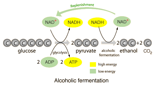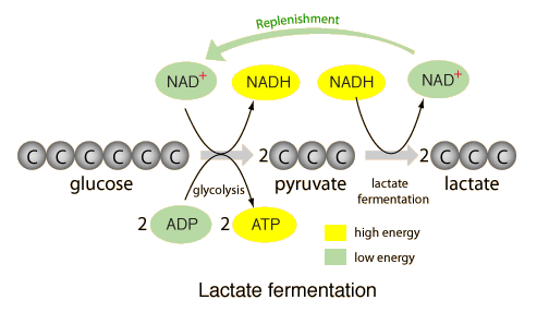 FermentationTwo pathways of anaerobic respiration in cells are fermentation pathways, one producing ethanol and the other producing lactate. Both fermentation processes replenish the necessary NAD+ for glycolysis to proceed with its net yield of 2 ATP molecules per glucose. ![]() ![]()