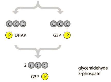 The fructose-1,6-biphosphate is split into two three-carbon molecules, each having one phosphate group attached. The dihydrooxacetone (DHAP) quickly rearranges to form another G3P molecule, so the net result is two G3P molecules. |  |