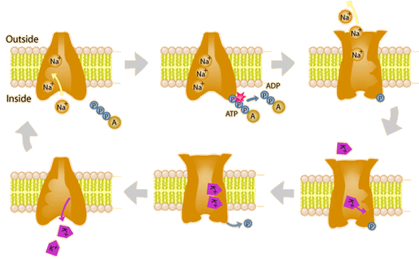 The process of moving sodium and potassium ions across the cell membrance is an active transport process involving the hydrolysis of ATP to provide the necessary energy. It involves an enzyme referred to as Na+/K+-ATPase. This process is responsible for maintaining the large excessof Na+ outside the cell and the large excess of K+ ions on the inside. A cycle of the transport process is sketched below. It accomplishes the transport of three Na+ to the outside of the cell and the transport of two K+ ions to the inside. This unbalanced charge transfer contributes to the separation of charge across the membrane. The sodium-potassium pump is an important contributer to action potential produced by nerve cells. This pump is called a P-type ion pump because the ATP interactions phosphorylates the transport protein and causes a change in its conformation. |