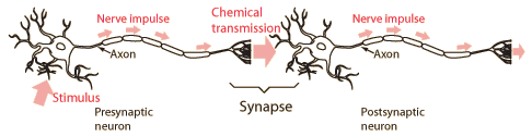 The nerve cells which are used for the perception of external events will, upon being excited by the proper stimulus, transmit an action potential down their axons. When the electrical signal reaches the axon terminal bundle, it interacts with structures called synaptic knobs. It stimulates an influx of calcium (Ca2+) through voltage-gated Ca2+ gates. This caused the movement of vescicles toward the membranes of the synaptic knobs. Inside these vescicles are neurotransmitter chemicals. The neurotransmitters are manufactured in the cell body and travel down t he axon to be stored in vescicles associated with the synaptic knobs. When a vesicle reaches the cell membrane of the synaptic knob, it fuses with the cell membrane and releases its neurotransmitter into the synaptic region. On the postsynaptic neuron are receptors that will specifically bind these neuotransmitters. The neurotransmitter will either excite or inhibit the firing of the postsynaptic neuron.