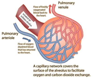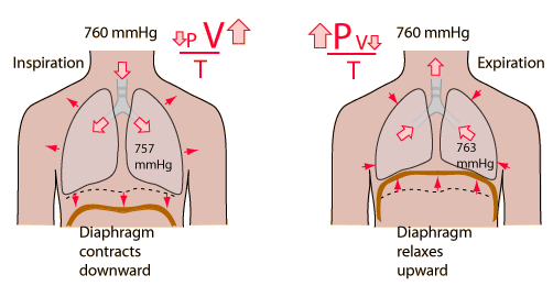 We can inhale by lowering the diaphragm to expand the volume of the chest cavity. By the ideal gas law we know that an expanded volume will lower the pressure and allow air to flow into the lungs through the bronchial passages. Exhalation can be accomplished by just relaxing the chest and allowing the elastic recoil of the alveoli to force the air out of the lungs. This elastic recoil is related to the wall tension of the alveoli and behaves according to LaPlace's law.