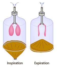 The above diagram follows the perspective of Thibadeau & Patton. Upon inspiration, the pressure in the alveoli is on the order of 2-3 mmHg below the atmospheric pressure of 760 mmHg. The relaxing of the diagphragm plus the elastic recoil of the alveoli provides a pressure some 3 mmHg above atmospheric pressure to accomplish expiration. At right is a sketch of a lung model used to demonstrate the nature of the breathing process. A rubber membrane simulates the action of the diaphragm.