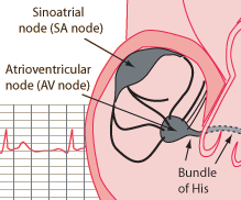 In the upper part of the right atrium of the heart is a specialized bundle of neurons known as the sinoatrial node (SA node). Acting as the heart's natural pacemaker, the SA node "fires" at regular intervals to cause the heart of beat with a rhythmn of about 60 to 70 beats per minute for a healthy, resting heart. The electrical impulse from the SA node triggers a sequence of electrical events in the heart to control the orderly sequence of muscle contractions that pump the blood out of the heart.
