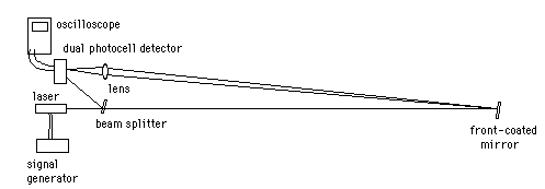 Equipment NeededModulated Helium-Neon laser, Metrologic Model ML-868Double photo-detector and amplifier for detecting laser at beginning and end of path. Beam splitter Signal generator for modulating the laser. Oscilloscope Front-faced plane mirrors and mirror holders Converging condenser lens for the second photodetector. 9V battery for detector box. Frequency counter Several BNC cables and about 2 ea red and black banana leads abt 18" Four BNC tees |