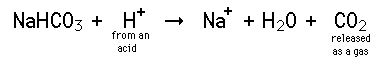 This reaction is an important part of the leavening which takes place in baking. Baking powder contains sodium bicarbonate and a weak acid (cream of tartar) in dry form. No reaction occurs in the dry powder, but when water is added for cooking, the reaction above occurs to release carbon dioxide to make the baked item "rise".