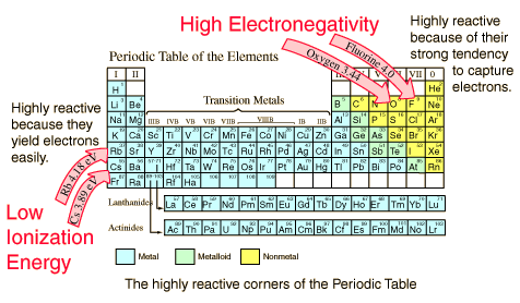 Ionization Energy and Electron AffinityThe ionization energy or ionization potential is the energy necessary to remove an electron from the neutral atom. It is a minimum for the alkali metals which have a single electron outside a closed shell. It generally increases across a row on the periodic maximum for the noble gases which have closed shells. For example, sodium requires only 496 kJ/mol or 5.14 eV/atom to ionize it while neon, the noble gas immediately preceding it in the periodic table, requires 2081 kJ/mol or 21.56 eV/atom. The ionization energy can be thought of as a kind of counter property to electronegativity in the sense that a low ionization energy implies that an element readily gives electrons to a reaction, while a high electronegativity implies that an element strongly seeks to take electrons in a reaction. The electron affinity is a measure of the energy change when an electron is added to a neutral atom to form a negative ion. For example, when a neutral chlorine atom in the gaseous form picks up an electron to form a Cl- ion, it releases an energy of 349 kJ/mol or 3.6 eV/atom. It is said to have an electron affinity of -349 kJ/mol and this large number indicates that it forms a stable negative ion. Small numbers indicate that a less stable negative ion is formed. Groups VIA and VIIA in the periodic table have the largest electron affinities. ![]()