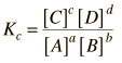 Chemical Equilibrium ConstantsChemical reactions may be envisioned in terms of reactants and products and written in the general form ![]() The reaction may be spontaneous,in which case the reactants would continue to react until they are exhausted with the end composition being nearly all product. In other cases a significant amount of energy must be supplied to get the reaction to go at all, so that the reactants, left to themselves, would remain in their current form. In intermediate cases, there may be some particular mixture which will exist at equilibrium. It is in those cases where the idea of an equilibrium constant is of greatest value. The equilibrium constant may be expressed in the form ![]() where [C] represents the molar concentration of C at equilibrium. For a given reaction, the concentrations at equilibrium would have to be determined experimentally. For gaseous reactants it is more convenient to express the equilibrium condition in terms of the partial pressures of the reactants and products. For this case the equilibrium constant is defined by ![]() where P denotes the partial pressure, usually in atmospheres. The two forms of the equilibrium constant are related by ![]() where Dn is the sum of the coefficients of the gaseous products in the chemical equation minus the sum of the coefficients of the gaseous reactants. In application, there are practical cases where some of the reactants and/or products do not appear in the equilibrium constant expression. When there are pure solids or pure liquids involve, the concentrations are treated as one for these substances, so they do not affect the equilibrium constant. The nature of the equilibrium constant allows us to make some qualitative judgments about the reaction. The general rules are: