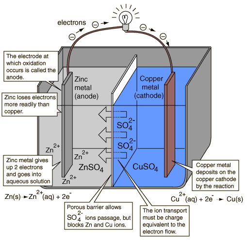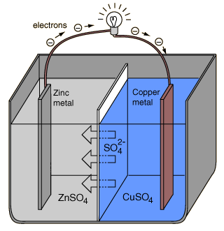 Voltaic CellsAn electrochemical cell which causes external electric current flow can be created using any two different metals since metals differ in their tendency to lose electrons. Zinc more readily loses electrons than copper, so placing zinc and copper metal in solutions of their salts can cause electrons to flow through an external wire which leads from the zinc to the copper. ![]()