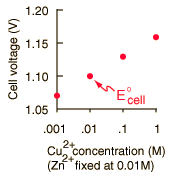 By numerically exploring the above calculation, you can confirm that large concentration differences between the anions and the cations can cause the voltage to differ significantly from the standard cell potential, and that such large concentration differences also make the cell potential more temperature dependent. |
